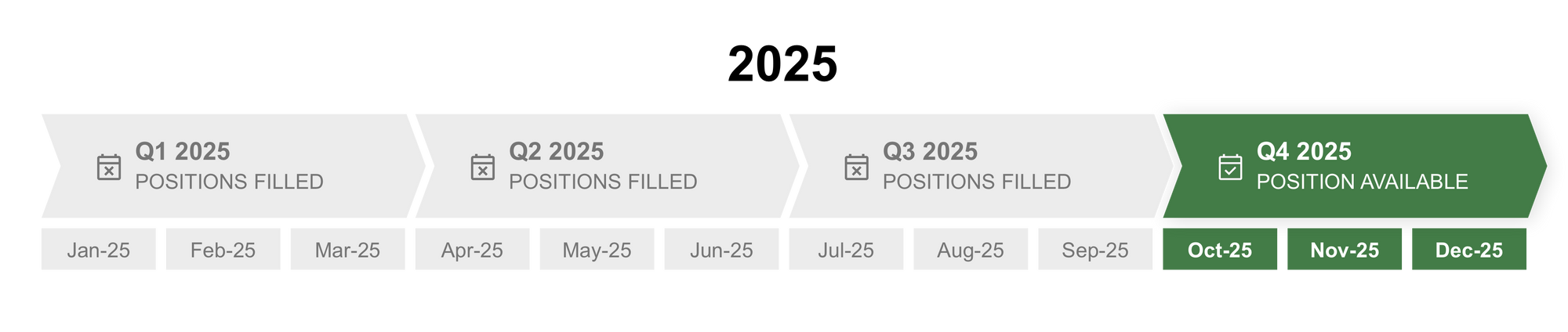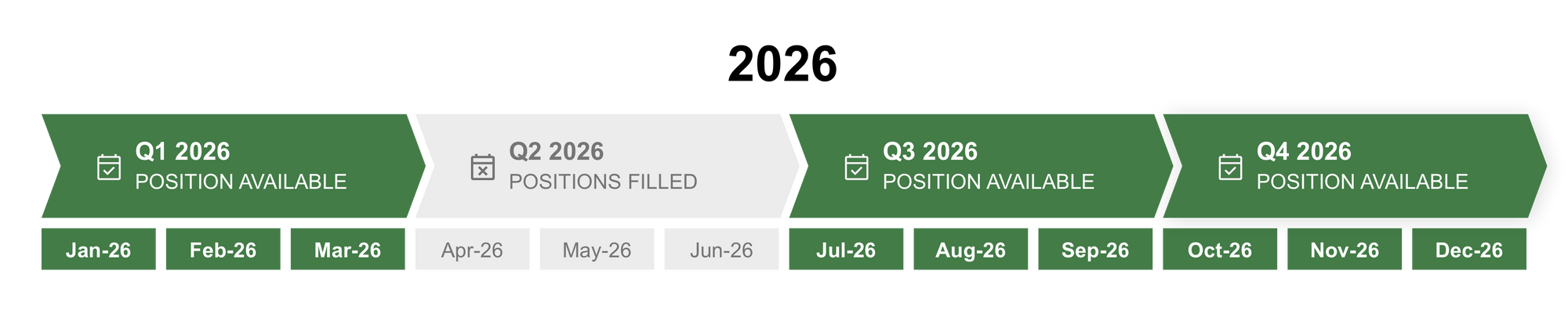 Internships are organised in fixed 3-month blocks with quarterly start dates (January, April, July, October). During the application process, we will ask you to select your preferred block(s) — you can find all available options listed below. In exceptional cases, we can accommodate alternative dates, for example, if your university requires a specific duration.